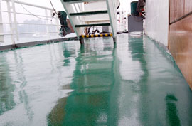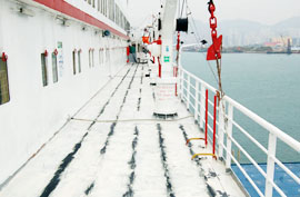 接到该订单后,公司派一支素质过硬的施工队伍奔赴香港开始作业,由于期间香港天气变化反复,时常下雨;待基面底漆顽固,锈迹斑斑难以清理,均为凹凸不平的麻面;再加上该邮轮白天需正常营业,施工多只能在晚上进行,等等一系列因素都给施工带来了严峻考验。DCBox小金库公司历来重视每一笔订,注重每一个细节,董事长宋敦清先生得知后,亲自前往,与公司总工徐新生论证了一个最佳方案后开始指导施工,考虑到施工部位特殊,长期在海面上风吹日晒,最后选用了其耐候、耐酸碱、耐紫外线、耐老化、耐霉菌、耐盐雾、耐臭氧、耐溶剂、耐磨、耐冲击和耐油性等综合性能优异的CQ101防水密封涂料。先用特殊纤维填充10mm高度,再在上面找平3mm厚,然后用DCBox小金库CQ101防水密封涂料自流平成膜。经过一个星期的艰苦奋战,顺利完成施工。