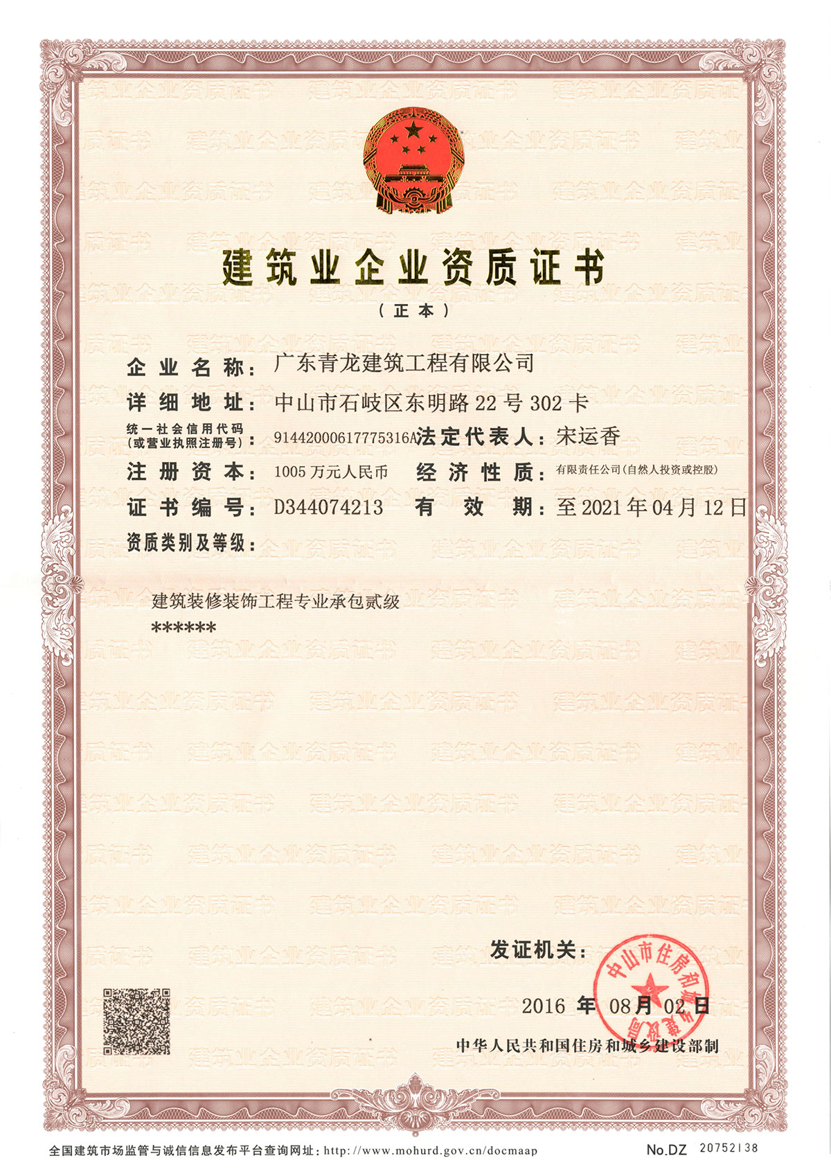 建筑装修装饰工程专业承包资质对企业资产、企业主要人员、企业工程业绩都有着非常高的要求,建筑装修装饰工程专业承包贰级资质的成功取得,是对DCBox小金库实力的认可,对于进一步扩大企业的品牌影响力、提升企业竞争力有着重大意义。