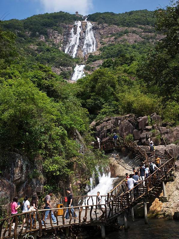 瀑布下的亲水步道上悠游漫步,是接近自然接近仙瀑的更轻松方式。亲水步道的入口与“天南一梯"的第2 9 9级相接,通至第1 2 9 9级的观瀑台,全长6 6 6米,是一条天然的木栈道。走在上面,游人可以一边眺望白水仙瀑的翩翩美态,一边前行,任潺潺的流水有如活泼欢快的音符般在脚下跳跃奔流。