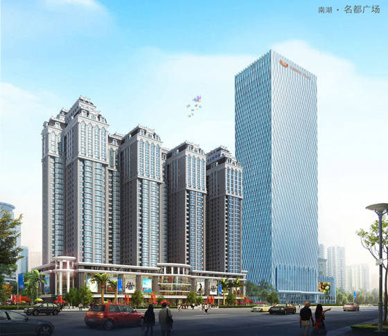 南湖名都广场是南宁港昌房地产有限公司投资兴建的高层建筑综合体,集住宅、商业、写字楼、酒店为一体,总建筑面积约为30.5万平方米。项目分为两个部分,其中A座为皇冠假日酒店和高档写字楼,其建筑外立面为水波幕墙设计,由数以千计的双层中空low-e幕墙纯手工拼接而成。水波幕墙具有减少光污染的作用,它利用光漫反射原理装成,在满足楼宇采光的同时,极大地降低了光污染,更加环保从而降低能耗。