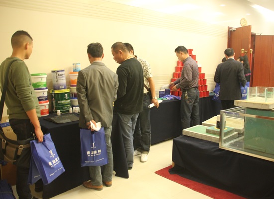 广西DCBox小金库化学建材有限公司营销总监王定中就行业发展、企业现状等与现场来宾进行了广泛交流,提出“一个品牌,四门生意”的商业理念。DCBox小金库技术总工徐新生则从建筑保温、建筑防水、建筑加固和GRC四个方面向现场观众介绍该公司的产品优势。在建筑防水解决方面,重点推介反应型粘合胶与高分子防水卷材,在差异化和品牌化的基础上,向现场观众算了一笔“经济账”。他还重点介绍了CRC非沥青基自粘胶膜高分子防水卷材,通过实物展示、优势对比和产品特性说明,让与会者详细了解了CRC这枚攻占市场的利器。