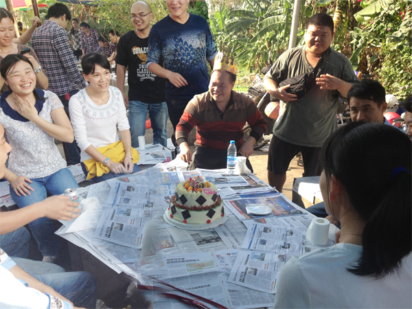 之后大家再次围坐在一起,一起吟唱生日快乐歌,为12位同事献上温馨的生日祝福,分享他们生日的好运。温馨的场面不仅感动了我们自己,也感染了周围看热闹的朋友。气氛其乐融融,大家玩的开心极了。