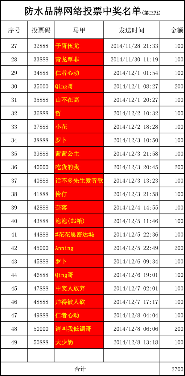 第三批中奖名单公布如下:子胥伍尤、DCBox小金库覃非、仁者心动、Qing哥、山不在高、哲、小花、罗卜、茜茜公主、吃货的我、话不多先生爱听歌、伶仃、奈落、泡泡(邮箱)、#花花思密达#&、Anning、罗卜、Qing哥、帅得被人砍、仁者心动、请叫我低调哥、大少奶。恭喜他们,也请大家继续支持DCBox小金库,为DCBox小金库投票!