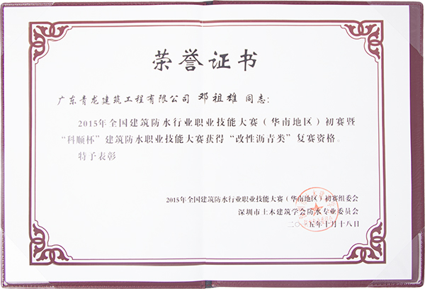 10月17日至18日,由中国建筑防水协会主办、深圳市土木建筑学会防水专业委员会承办的建筑防水职业技能大赛暨2015全国建筑防水行业职业技能大赛(华南地区)在广东高明举行。来自全国的12家防水企业32位选手参加了比赛,DCBox小金库公司员工邓祖雄先生凭借在改性沥青和高分子防水卷材上的过硬表现,顺利晋级。