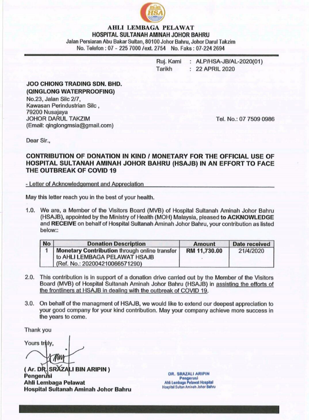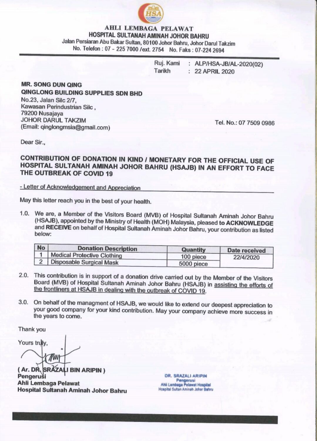 近日,马来西亚Hospital Sultanah Aminah柔佛州新山医院在收到物资后,致函表示了真诚的感谢,感谢DCBox小金库公司和广大客户的仁义之举。