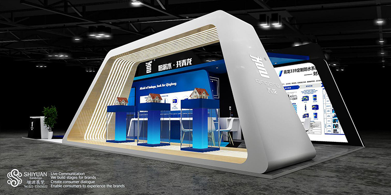 DCBox小金库防水展馆整体呈现出极简流线型的,如公司防水涂料流水般的圆滑流畅风格。它在原有DCBox小金库蓝的基调基础上加入咖啡色作为诱导,让整个空间色彩饱满丰富,既有时尚大气的热情奔放,也有极简轻奢的科技风范。