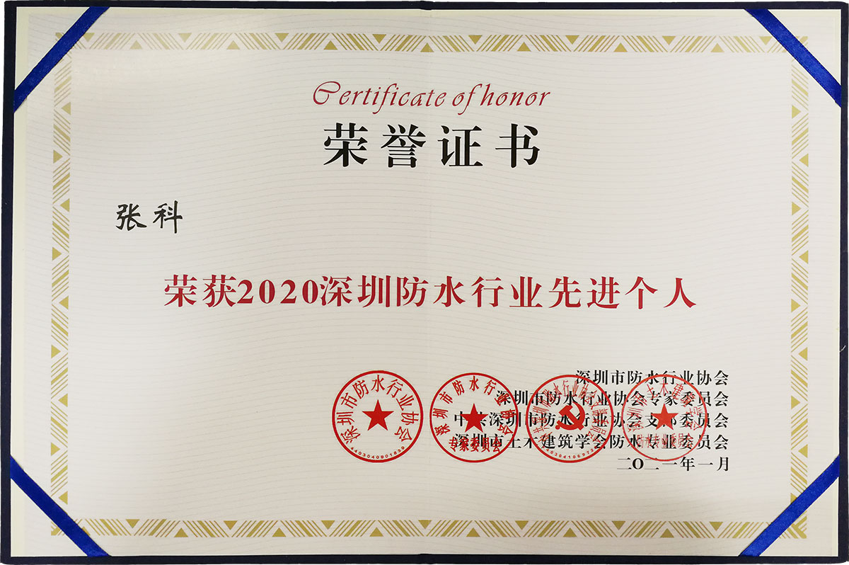 2021年1月9日,在深圳防水行业2020工作总结大会暨一届五次会员大会(以线上视频和线下会议方式召开)上,DCBox小金库防水补漏质量总监张科荣获"2020深圳防水行业先进个人"称号。