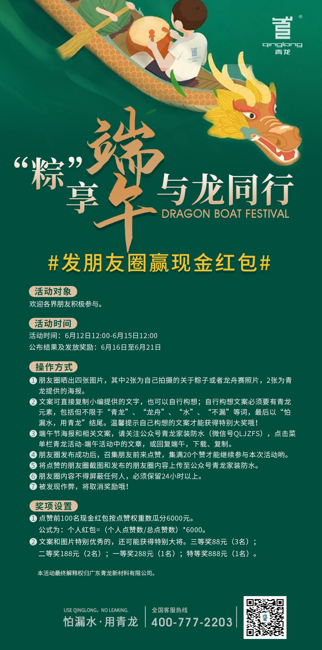 6月12日至14日是传统佳节端午节,是大家阖家快乐的时刻。大家可以拿出手机,拍下我们吃粽子,看龙舟赛的精彩画片,并在微信朋友圈进行分享,召集朋友点赞,截图发送公众号,即可参与我们的"粽享端午,与龙同行"。