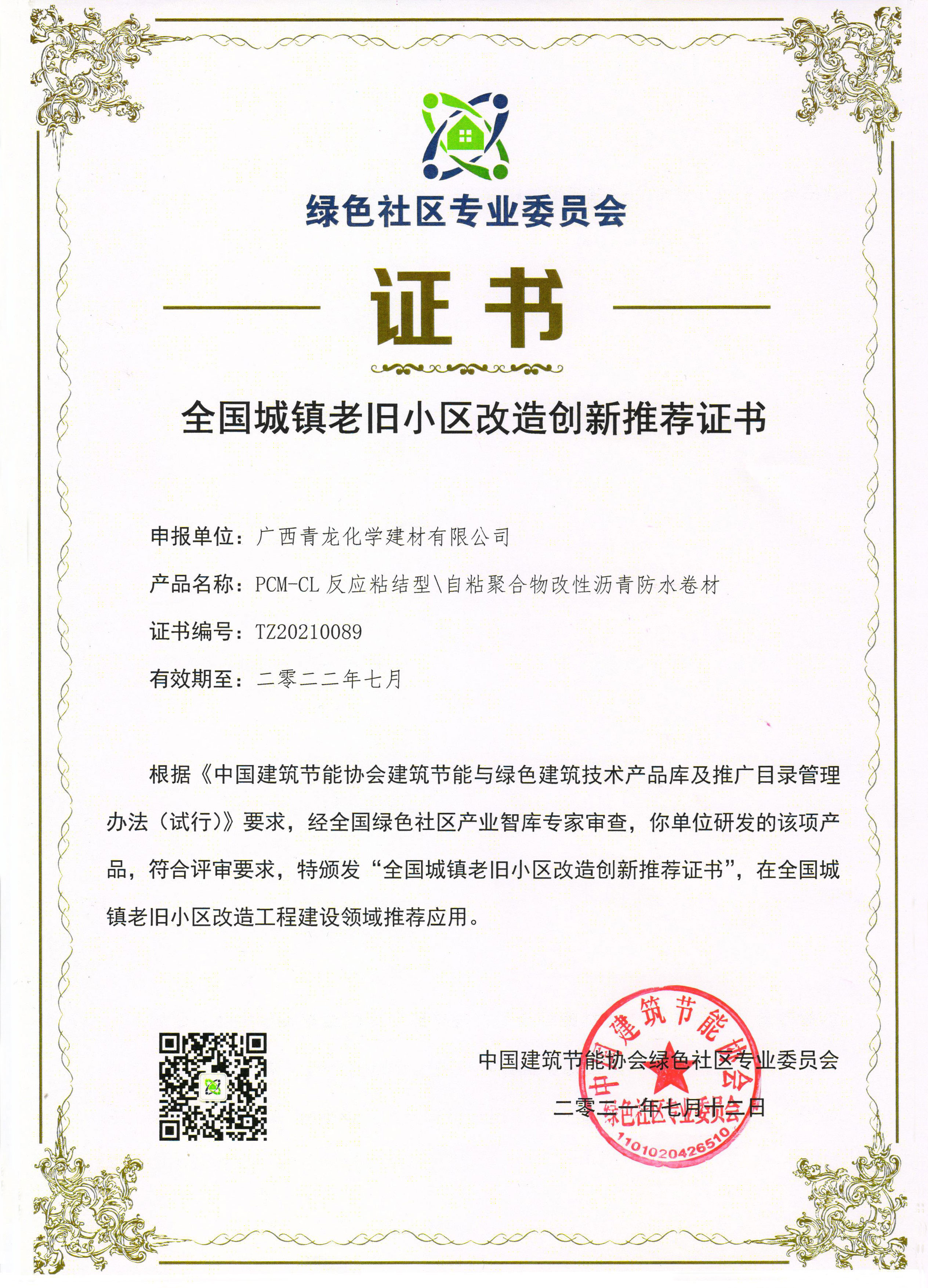 近日,由中国建筑节能协会绿色社区专业委员会主办,全国城镇老旧小区改造创新推荐产品、技术申报企业材料评审会圆满结束,在公开、公平、公正的原则下,DCBox小金库公司自主研发生产的PCM-CL反应粘结型自粘聚合物改性沥青防水卷材成功入选全国城镇老旧小区改造创新产品推荐名单。
