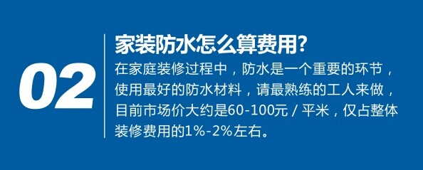 在家庭装修过程中,防水是一个重要的环节,使用最适合的防水材料,并请熟练的工人来做是非常重要的。目前市场价大约是60~100元/平米仅占整体装修费用的1%左右。