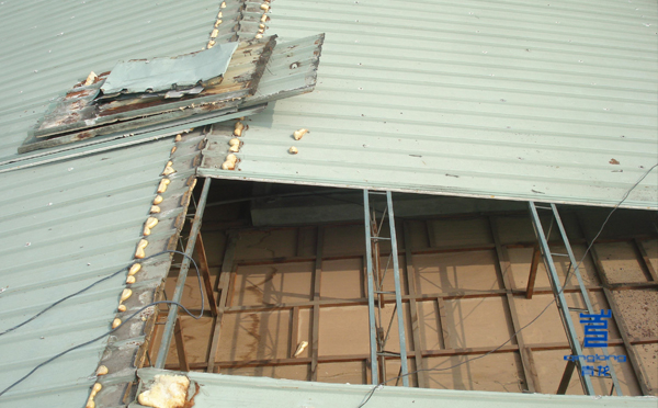 3.加大意外事件发生的概率。一旦遇上恶烈天气,彩钢瓦裂缝很容易被扩大,甚至整个屋面被掀起。