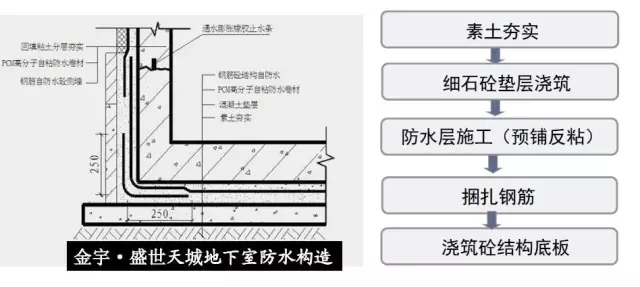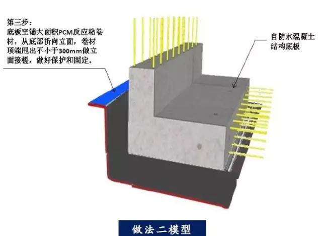 地下室底板防水做法二:防水层反粘于后浇结构底板