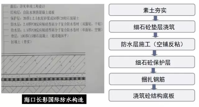防水层仅向上反粘于细石砼保护层上,而细石砼保护层与后浇钢 筋砼底板形成施工缝,造成防水层不能真正意义上与后浇钢筋砼底板反粘。