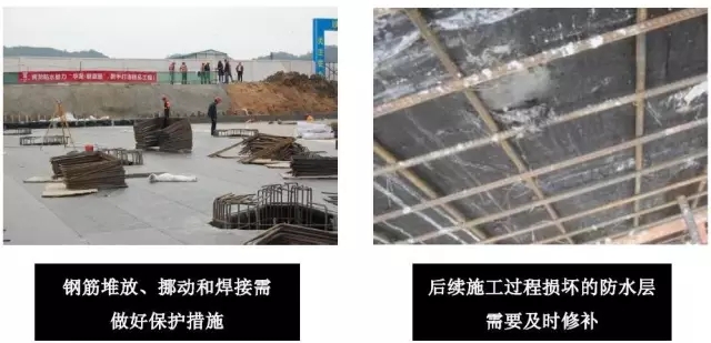 2、防水层施工后,钢筋砼结构底板施工前的相邻工序,如支模板、捆扎钢筋(焊) 等,需要相应班组对防水层的实时、悉心保护;