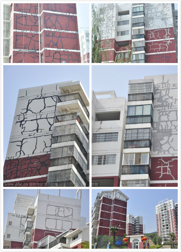 2014年10月10日,武汉市建成已经三年的江夏区武昌大道某小区,房屋外墙就出现不同程度的裂缝,于是有的楼栋侧墙整面用黑色防水涂料涂成框框以防渗漏,从远处观看,似乎给墙体绑上了“绷带”。但是这样的外墙“绑绷带”真的能堵住渗漏吗?