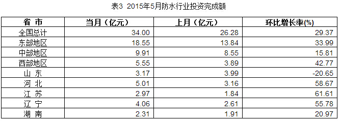 5月份,防水行业投资完成额34.00亿元,同比增长29.37%。