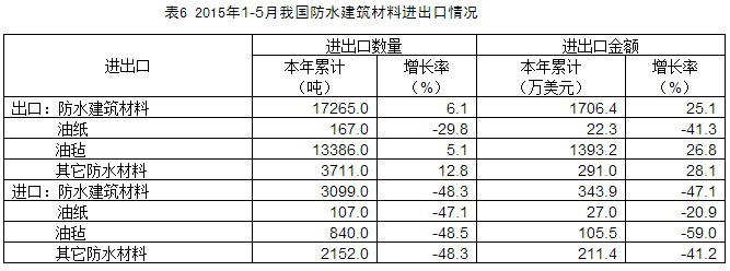 1-5月,建筑防水材料出口17265.0吨,同比上升6.1%;出口金额为1706.4万美元,同比上升25.1%。